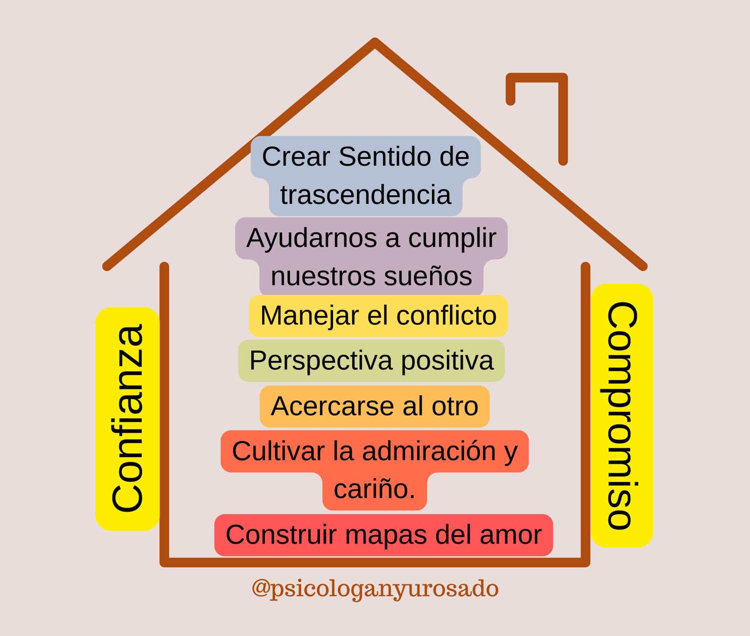 Con el tiempo fui conociendo algunas teorías que me ayudaron a entender mucho mejor las relaciones de pareja, entre ellas estuvo el método Gottman, ésta metodología me ayudó a sentirme más segura al relacionarme, ellos tienen una estructura llamada “La casa de la relación sólida” la cual te muestra los puntos centrales que te ayudaran a construir una relación sana y de larga duración, te mostraré a continuación más sobre éste: